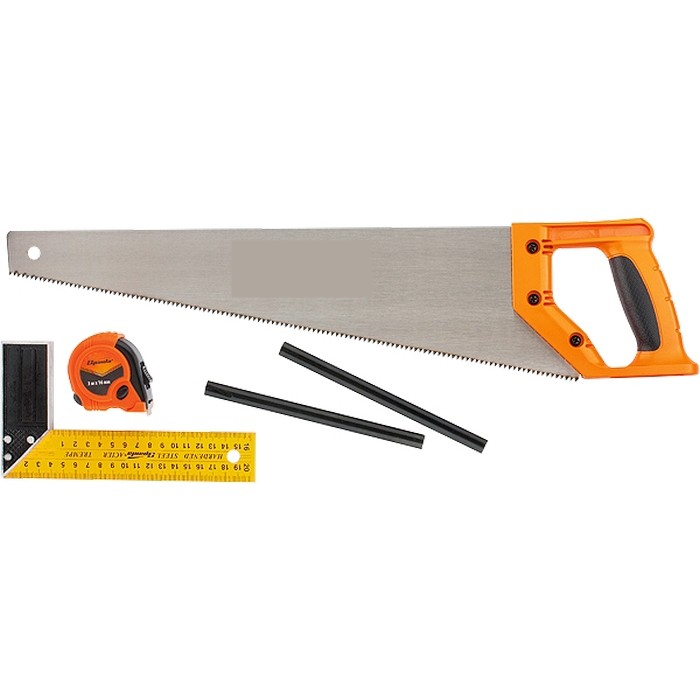 В набор входит ножовка для распиловки, рулетка, карандаш, угольник.
